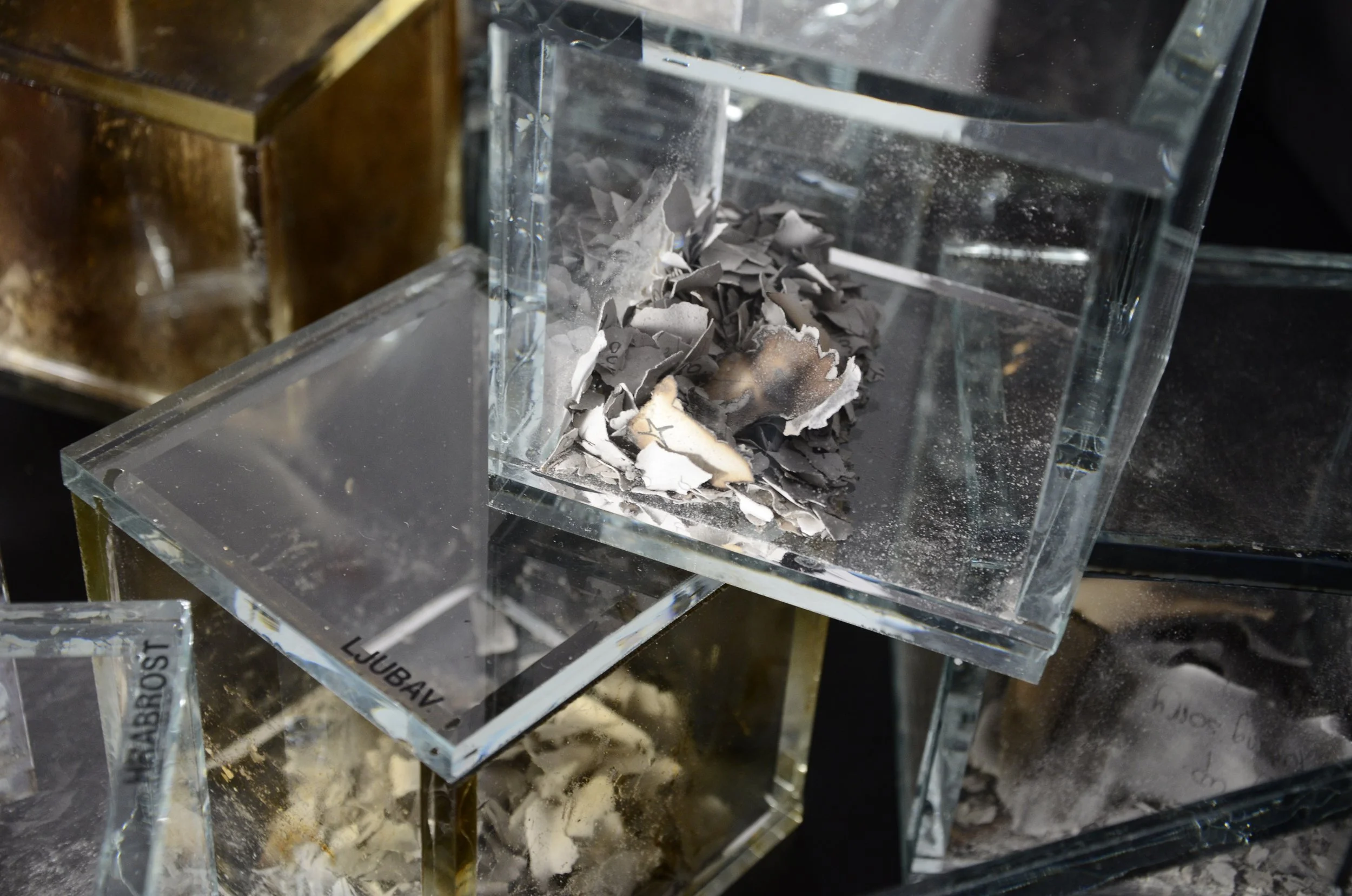 Glass boxes, ash, hidden symbols in the words marked on the boxes. Glass boxes or cubes contain the burned pages of a personal diary.